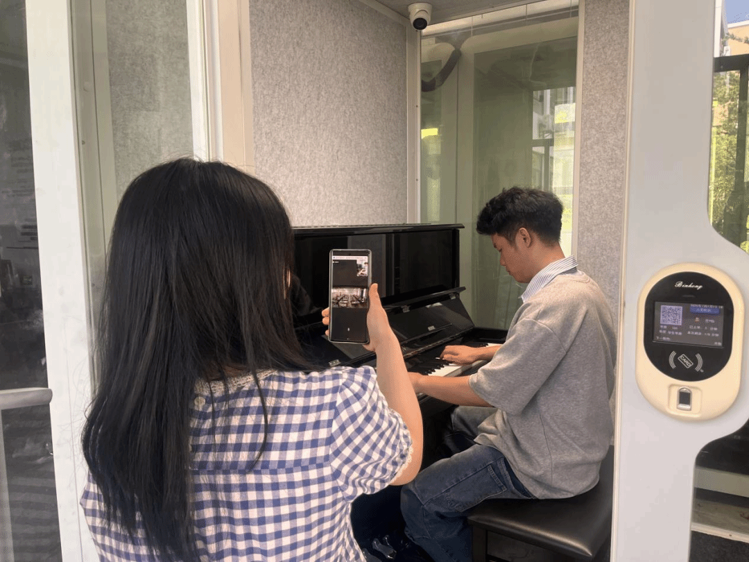精心策划了一场云端音乐之旅。研究生欧阳国俊化身讲解员,带领晴隆六小的孩子们在线探访智慧琴房、乐器房与音乐厅。在智慧琴房,他详细介绍了智能教学系统、预约系统等功能,还现场展示了钢琴曲《肖邦降 b 小调夜曲》,让孩子们在悠扬琴声中感受古典音乐的魅力;方雨朵同学则以一曲琵琶《龙船》,展现属于中国民族音乐的独特韵味。