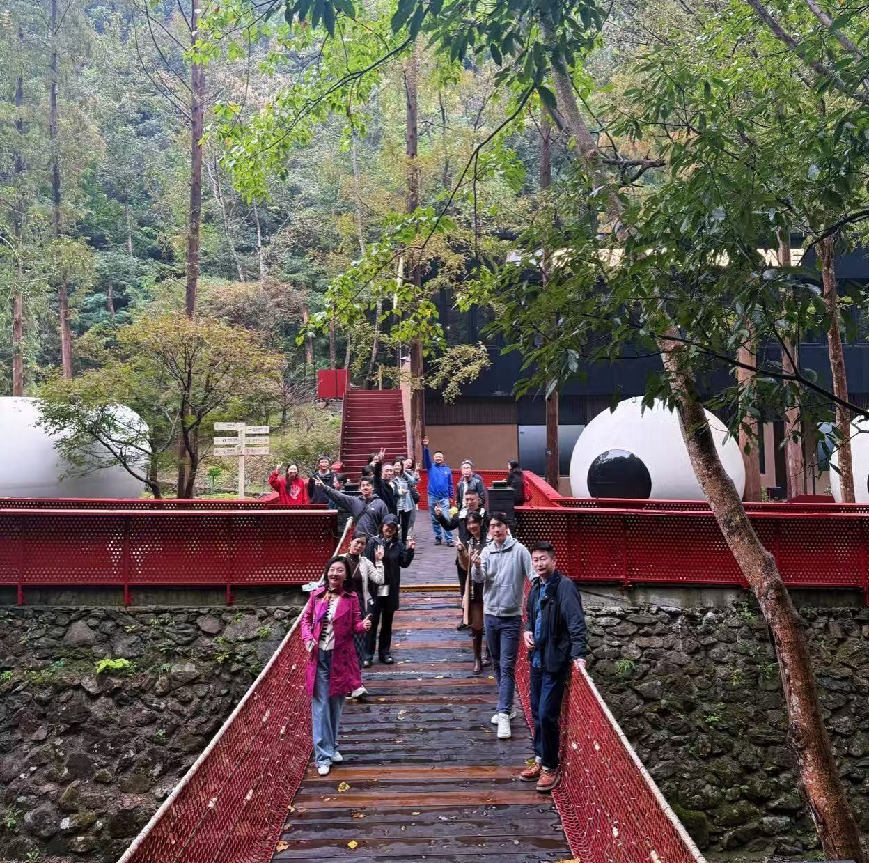 活动首日,教职工们来到国家AAAA级景区宁海森林温泉公园。深秋的公园层林尽染,温泉氤氲。大家沿步道徒步游览,呼吸清新空气,欣赏溪流、瀑布与红叶交织的自然景观。在这被誉为“华东第一森林温泉”的秘境中,近万亩阔叶乔木形成天然“大氧谷”,让老师们在繁忙的教学工作之余,得以放松身心,舒缓压力。